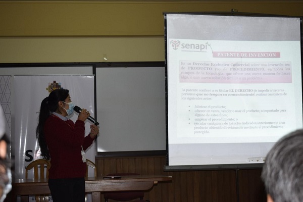 El taller inicio con la presentación de la Dra. Teodora Chocamani, representante del SENAPI, quien habló sobre la importancia de proteger de manera legal las investigaciones, proyectos y productos mediante el registro de derechos de autor y patentes. Explicó que, para conseguir una patente, los productos materializados deben ser novedosos y susceptibles para la aplicación industrial.