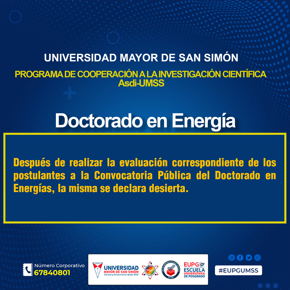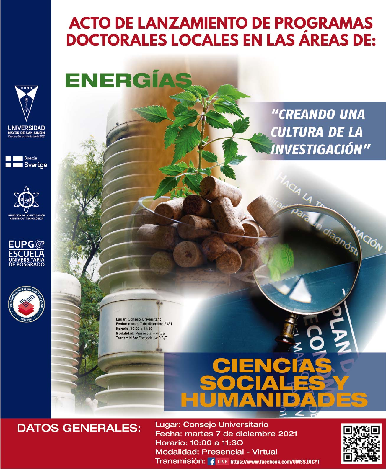 La Universidad Mayor de San Simón (UMSS) a través de la Escuela Universitaria de Posgrado (EUPG), la Dirección de Investigación Científica y Tecnológica (DICyT) y la Dirección Universitaria de Evaluación y Acreditación (DUEA) en aplicación del “Programa de Cooperación a la Investigación Científica entre la Agencia Sueca de Cooperación para el Desarrollo Internacional – Asdi y la UMSS”, ofrecen a profesionales jóvenes, que estén interesados en su formación como investigadores, plazas para realizar estudios de Doctorado a nivel Local en Energía.