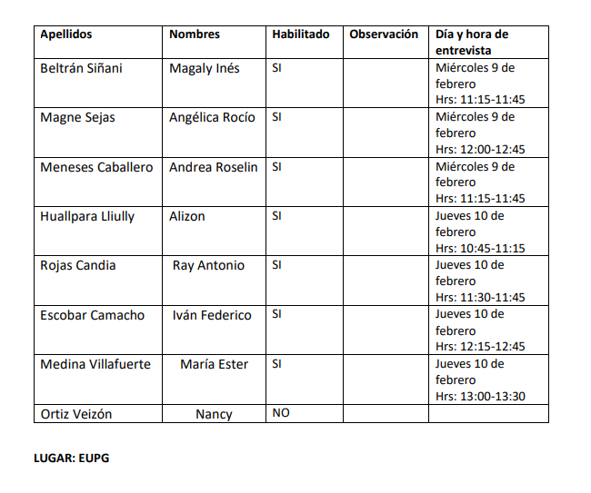 Lista de habilitados a la entrevista.