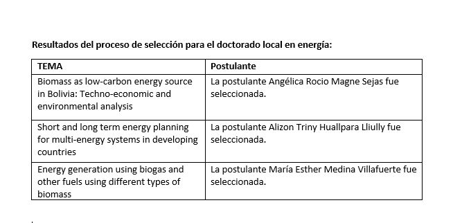 Resultados del proceso de selección para el doctorado local en energía: